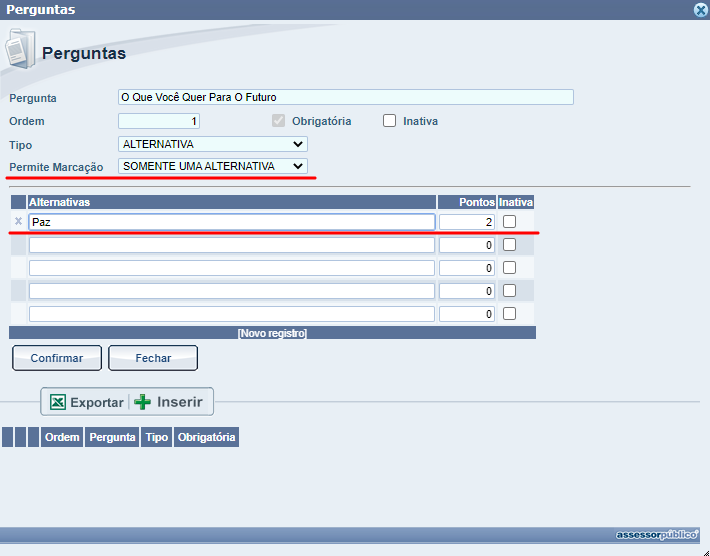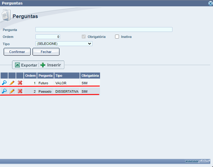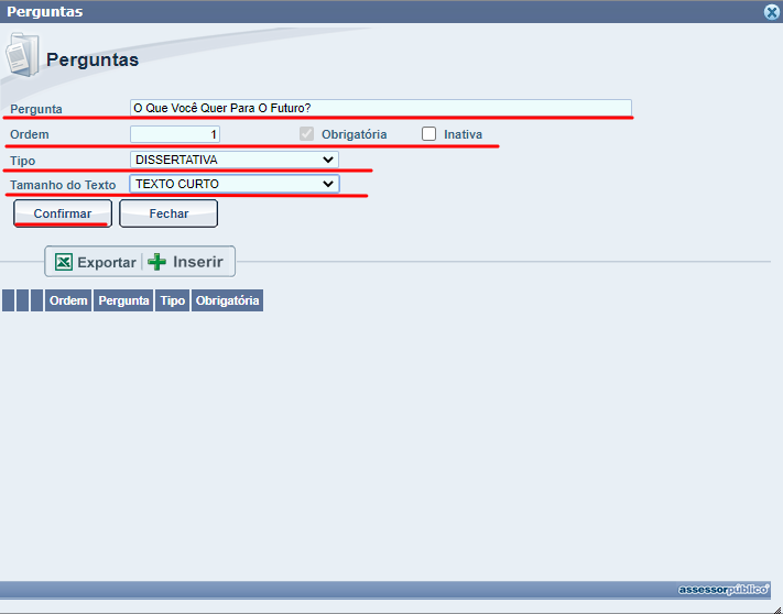 Após inserirmos a pergunta podemos clicar em confirmar para que seja gravada a mesma no sistema.