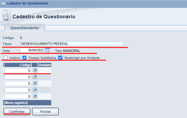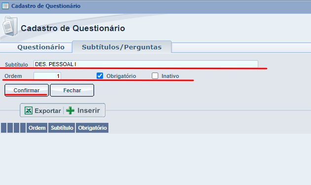 Após responder todas as perguntas podemos clicar em Confirmar para que as informações inseridas fiquem gravadas no sistema, após realizarmos essa ação a será criado um novo campo que irá conter o subtítulo do questinário e as perguntas respondidas :