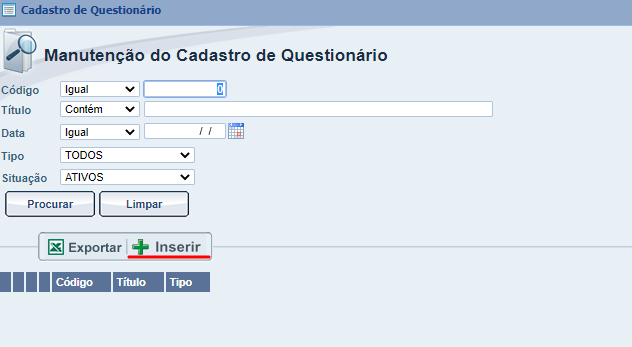 Uma nova tela será aberta, a Manutenção do Cadastro de Questionário, aqui nós podemos pesquisar todos os questionários cadastrados no sistema clicando em procura, agora como iremos criar um, vamos clicar em Inserir.