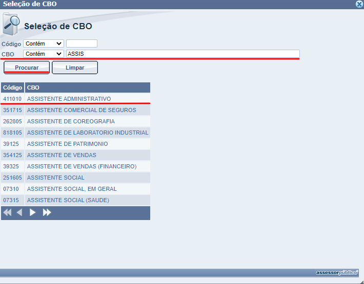 Ao clicar nela será aberta uma nova janela a qual nós podemos estar pesquisando a CBO desejada através da descrição da mesma. E ao clicar em cima da descrição da mesma, ela será selecionada. Devemos selecionar a CBO corretamente pois ela irá nos permitir acessar o questionário que criamos ou não.