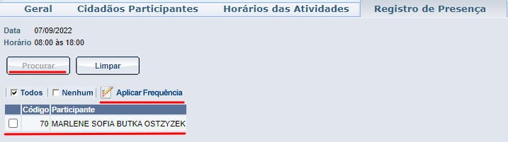 Com o horário e dia da semana selecionados podemos clicar agora em procurar, feito esses passo até agora em seguida ele irá mostrar todos os cidadãos que estão cadastrados nos grupos e que podem ser selecionados para ter presença ou falta. Para estar aplicando presença nós podemos estar clicando no quadrado branco ao lado do nome do cidadão e então clicar em "Aplicar Frequência". Para que seja aplicada falta podemos apenas deixar sem selecionar o quadrado branco ao lado do nome do cidadão em branco.