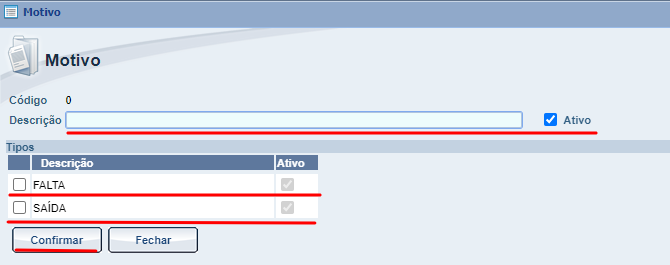 Será carregada então uma nova janela a qual irá conter os seguintes campos: Descrição: É a descrição que nós atribuiremos a um dos dois campos abaixo. Eles serão usados em registro de presença, mais a frente veremos isso. Falta: Caso este campo seja selecionado quando for o momento para aplicar a presença caso alguém não receba presença irá ter um campo “Motivo da Falta” ao lado de “Aplicar Presença”. Iremos ver sobre isso mais a frente. Saída: Diferente da falta, este campo está ligado a aba Cidadãos Participantes. A descrição desse campo constará no Motivo de Saída. Quando um integrante não fizer mais parte do grupo e ele for retirado. Assim como a falta iremos ver mais sobre logo a frente. Para que a informação seja gravada no sistema, iremos clicar em Confirmar.