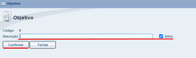 Nesse momento irá carregar uma nova janela a qual irá nos permitir criar o objetivo , haverá apenas um campo : Descrição: Aqui iremos inserir qual é o objetivo da atividade que foi desenvolvida. Ele será utilizado em “Dados da Atividade” na aba “Registro de Presença” Para que a informação seja gravada no sistema, iremos clicar em Confirmar.