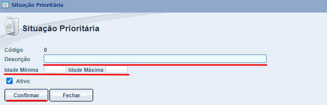 Idade Mínima: Aqui é colocado a idade mínima para que um cidadão esteja com esta situação prioritária. Idade Máxima: Aqui é colocado a idade máxima para que um cidadão esteja com esta situação prioritária.