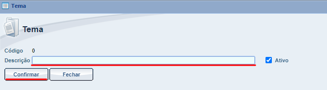 Em seguida o sistema irá carregar uma nova janela a qual terá 1 campo para preencher: Descrição: Aqui iremos colocar o nome do tema que será utilizado na aba “Registro de Presença” no campo “Dados da Atividade”.