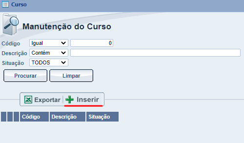 Para cadastrar um novo Curso podemos utilizar o mesmo passo a passo que fizemos antes mas agora clicaremos em Curso, após o clique irá abrir uma nova tela com o seguinte título: "Manutenção de Curso". Nesta tela para criarmos um novo curso iremos clicar em : Inserir.
