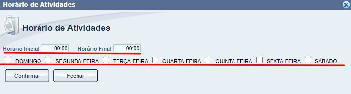 Em seguida irá abrir uma nova janela, a qual podemos selecionar o tempo que a atividade estará em prática e seus respectivos dias de desenvolvimento. Após ser inserido os horários de ínicio e de fim da atividade e os dias em que ela será realizada, podemos agora clicar em confirmar.