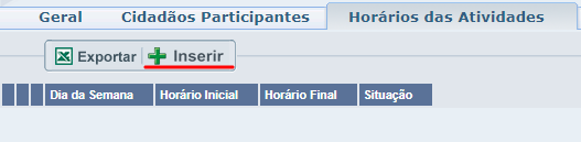 Estaremos agora criando os horários de atividades que o grupo irá realizar (Caso você tenha preenchido o campo : Carga Horária, as atividades deverão ser realizadas até o fim da carga horária estipulada).