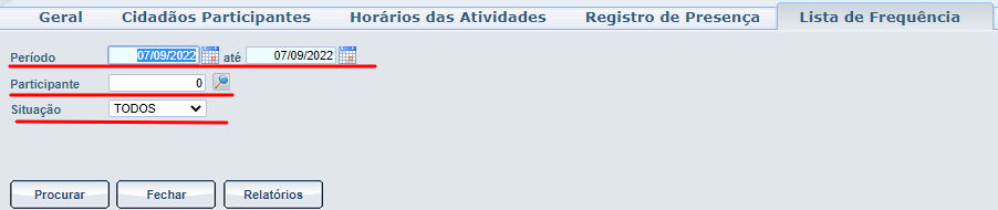 Participante : É disponibilizado a nós a opção de busca de participante, isso fará com que seja mostrado apenas o cidadão que foi selecionado, assim mostrando as atividades em que o cidadão estava presente ou ausente.
