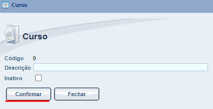 Após clicarmos em inserir irá abrir uma nova tela com o nome : Curso, nesta tela irá ter um campo "Descrição" para inserirmos o nome do curso, após inserirmos o nome do curso iremos clicar em confirmar para que as informações inseridas no campo "Descrição" fiquem salvas no sistema.