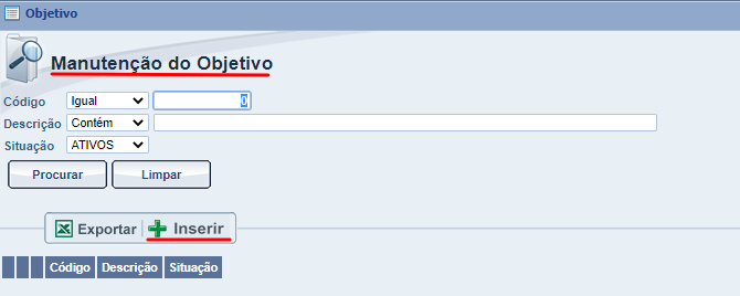Com o passo a passo feito novamente iremos agora clicar em objetivo, será aberto a janela manutenção de objetivo iremos clicar em : Inserir.