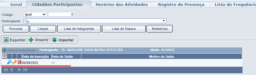 5° Data de Saída:Caso você queira retirar um cidadão que não faz mais parte do grupo em que ele estava basta apenas clicar no lápis, com isso feito a página irá carregar o cadastro do cidadão no grupo. Perceba que ao lado da data de inscrição do cidadão irá ter o campo “Data de Saída” A partir da data que for colocada nesse campo o cidadão não será contabilizado no grupo, e ele não será colocado na lista de presença.