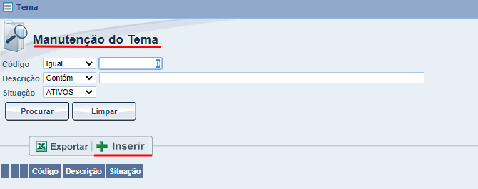 Com o passo a passo feito novamente iremos agora clicar em objetivo, será aberto a janela manutenção do Tema, iremos clicar em : Inserir.