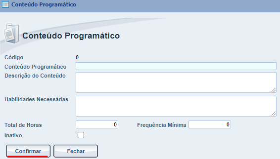 Após clicarmos em inserir irá abrir uma nova tela com o nome : Conteúdo Programático, nesta tela irá ter 5 campos para inserirmos informações: